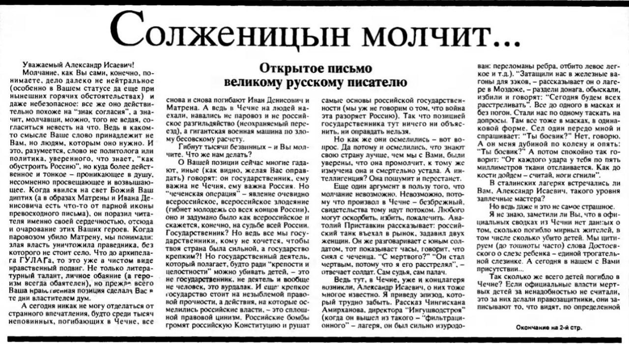 Ведь идут и идут из Чечни гробы, в них те, кого испокон веков называют цветом нации. И в безымянных могилах, во рвах тоже они. Ради чего все они погибли, Александр Исаевич? Ведь не уйти от этого вопроса. <...>