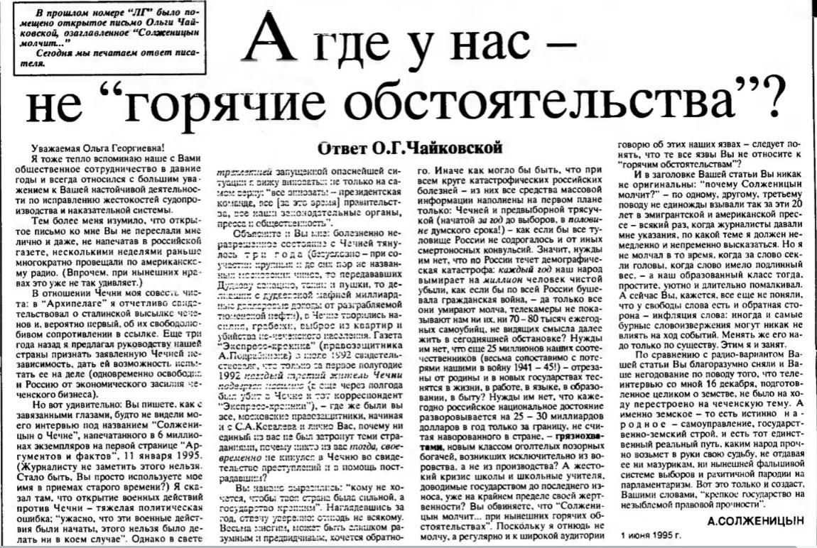 Ответ Солженицына Ольге Чайковской (Литературная газета, 7 июня 1995).